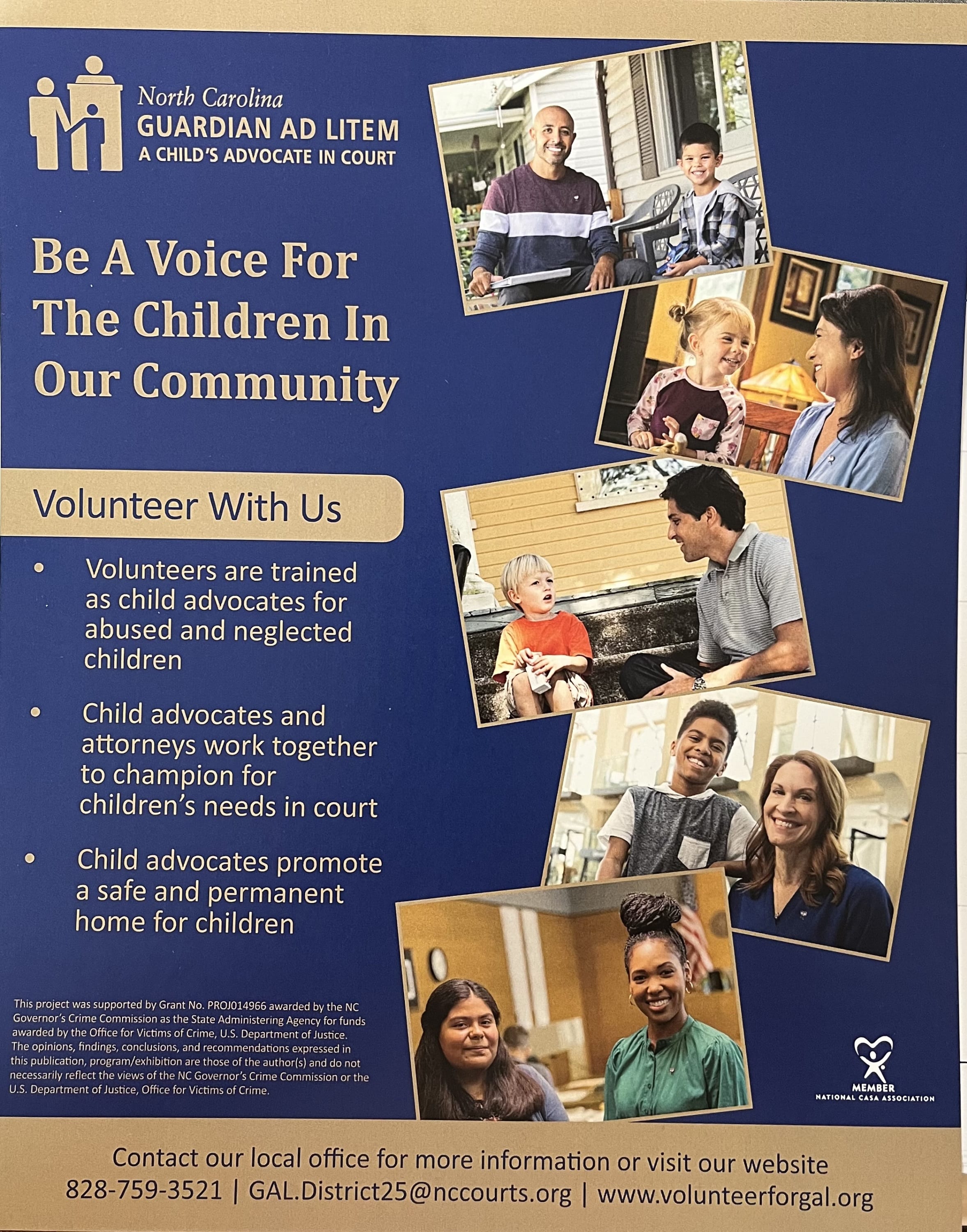 A Guardian Ad Litem is a trained community member appointed by a district court judge to investigate and determine the needs of abused and neglected children and youth petitioned into the court system by the Department of Social Services. The GAL is paired with an Attorney Advocate to represent the child's best interest in court.